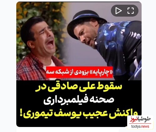 علی صادقی بازیگر سینما و تلویزیون فیلمی از او که در صحنه فیلمبرداری رئالیتی شوی تلویزیونی در حالی که وی به همراه یوسف تیموری، جواد خواجوی و قدرت الله ایزدی مشغول ضبط سکانس بودند، حادثهای رخ داد. این فیلم در فضای مجازی منتشر شدمورد توجه کاربران قرار گرفت اما مشخص نیست که این سقوط برای صحنه ضبط بود با حادثه!!