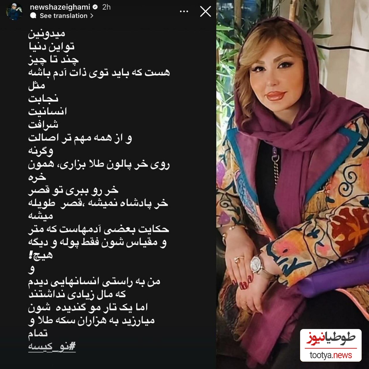 طوطیانیوز:نیوشا ضیغمی بعد از حضور فریبا نادری و صحبت های او درباره زندگی پولداری استوری منتشر کرد که مورد توجه کاربران قرار گرفته است.