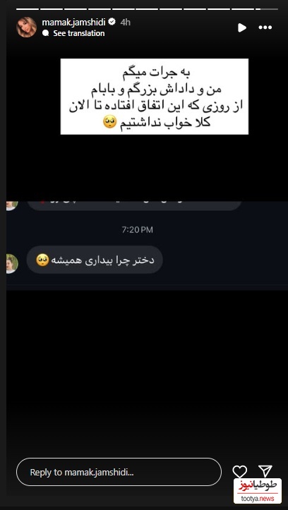 طوطیانیوز: تصویری از استوری جدید خواهر پژمان جمشیدی را ملاحظه می کنید.