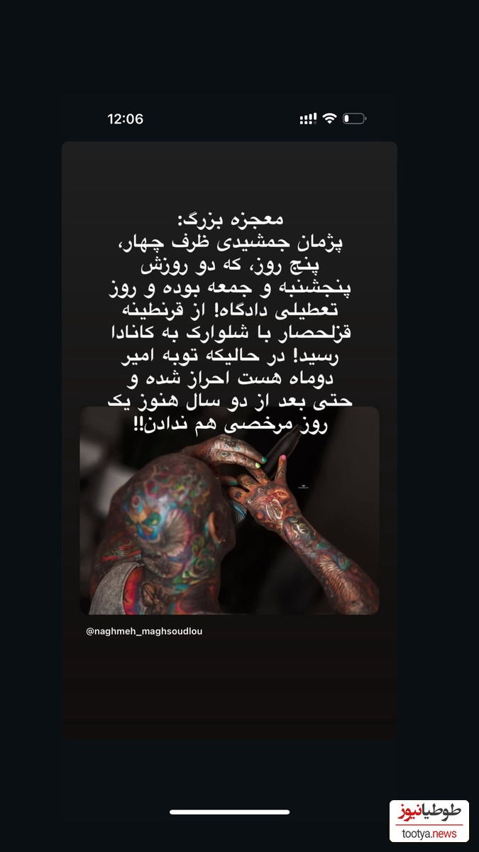 به گزارش سرویس هنر و رسانه طوطیانیوز، خواهر امیر تتلو، خواننده پرحاشیه، با انتشار پیامی در اینستاگرام نسبت به آزادی پژمان جمشیدی، بازیگر و فوتبالیست سابق، واکنش نشان داد. او نوشت که پژمان جمشیدی ظرف چهار، پنج روز از قرنطینه قزلحصار با شلوارک به کانادا رسید، در حالی که امیر تتلو حتی پس از دو سال هنوز یک روز مرخصی دریافت نکرده است.