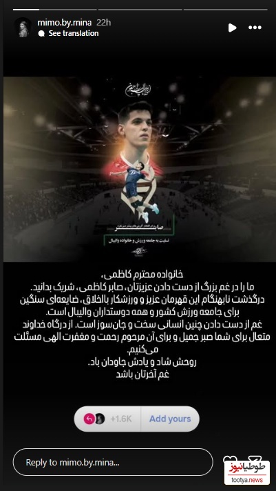 طوطیانیوز: تصویری از استوری مینا مختاری همسر بهرام رادان برای درگذشت صابر کاظمی را مشاهده بفرمایید.