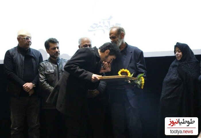 در ادامه این مراسم از خانواده مرحوم گنجی تقدیر شد و شهاب حسینی بر دستان پدر او بوسه زد.