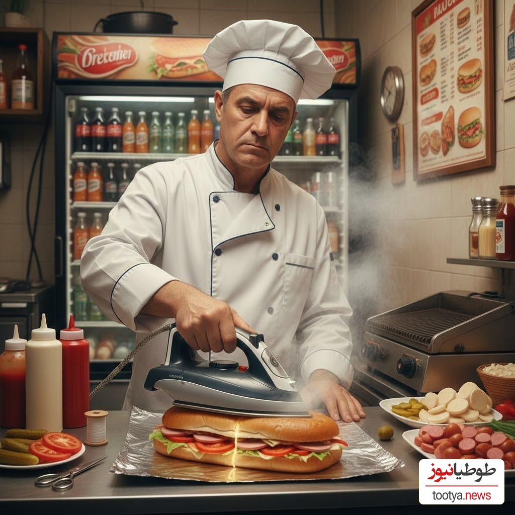 خلاقیت خندهدارساندویچفروش مخترع در آماده کردن غذای مشتریان با اتو/ من رفتم توی افق محو بشم😂+فیلم