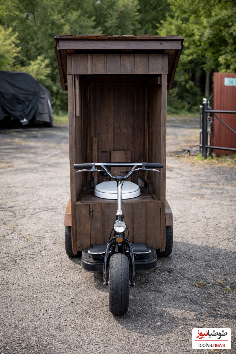 به گزارش سرویس چندرسانهای طوطیانیوز در تصویر، وسیلهای ابتکاری و غیرمتعارف دیده میشود که ترکیبی از یک اسکوتر موتوری کوچک و سازهای چوبی شبیه به اتاقک است. این اتاقک بهگونهای طراحی شده که کاربری آن یادآور یک سرویس بهداشتی سیار است و حتی صندلی توالت نیز در داخل آن قابل مشاهده است.